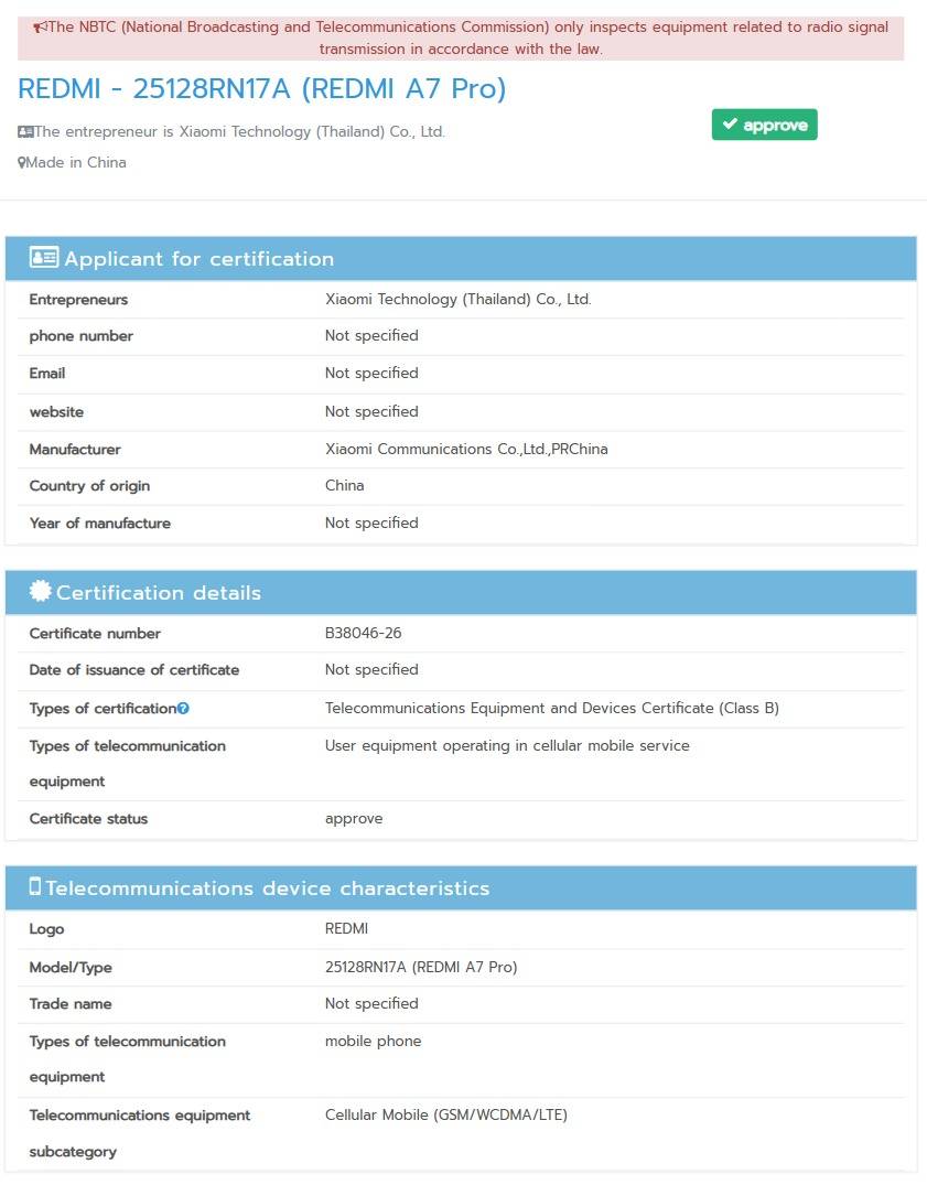 एनबीटीसी सर्ट एसोसिएट में यह मॉडल नंबर 25128RN17A के साथ लिस्ट हुई है, जहां इसके नाम की पुष्टि Redmi A7 Pro के रूप में हुई है। एनबीटीसी के अनुसार, Redmi A7 Pro को दूरसंचार उपकरण और उपकरण प्रमाणपत्र (क्लास बी) मिला हुआ है। यह सार्ट एसोसिएट आम तौर पर पहले लॉन्च किया जाता है, जिससे साफ संकेत मिलता है कि फोन की घोषणा जल्द ही की जा सकती है।